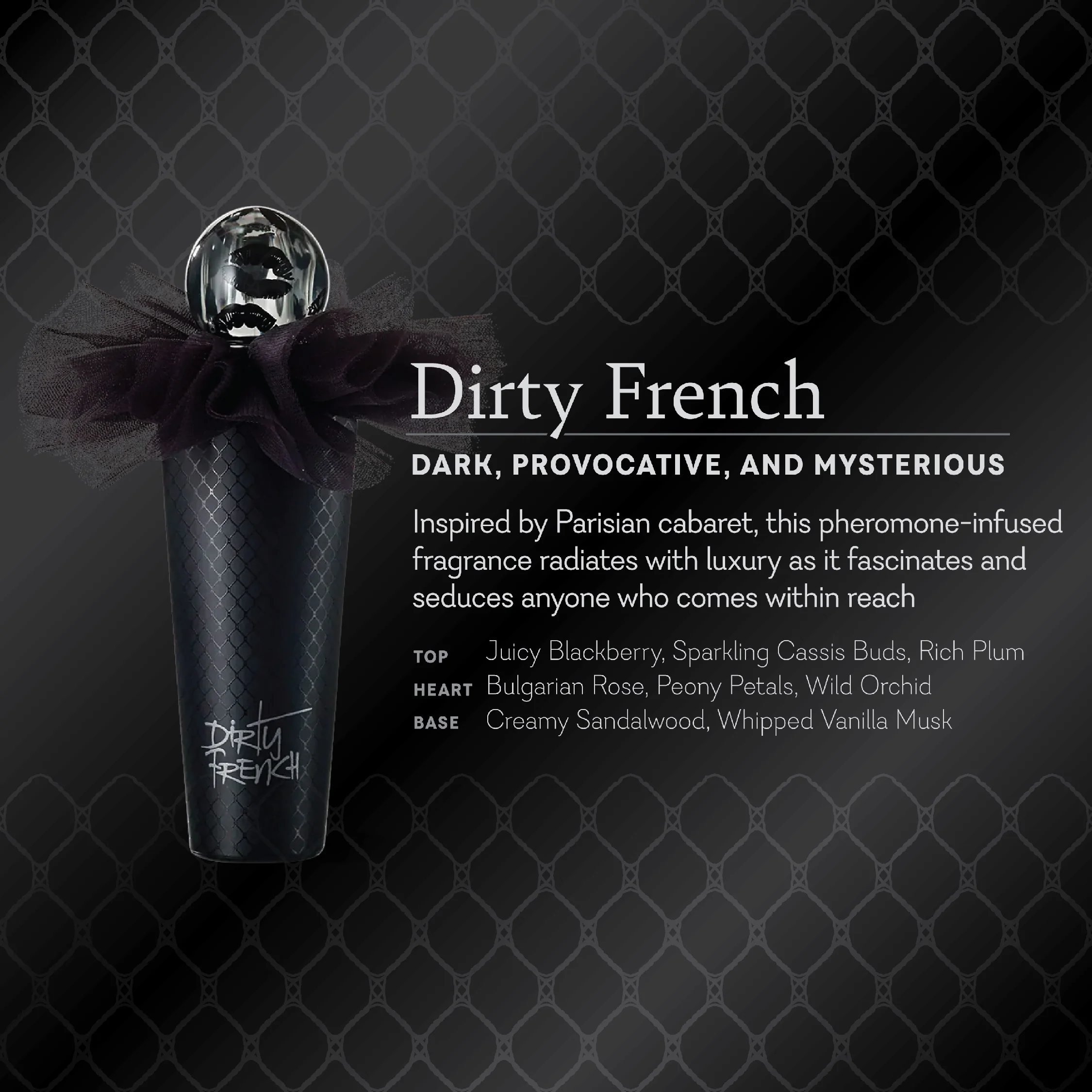 If luxury and mystery could be bottled, Dirty French would be it. Dark and provocative, Dirty French is inspired by the thrill of Parisian cabaret and wild, illicit kisses. This pheromone-infused luxury fragrance fascinates and seduces with its opulent display of wild orchid and juicy blackberries wrapped in whipped vanilla musk.
