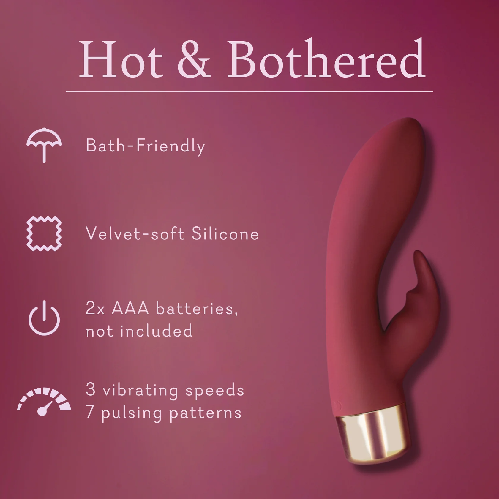 When you’re in the mood for a double dose of satisfaction, it’s time to get Hot & Bothered. This dual-action vibrator has a curved shaft and textured clitoral massager that will build you up and never let you down.