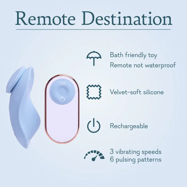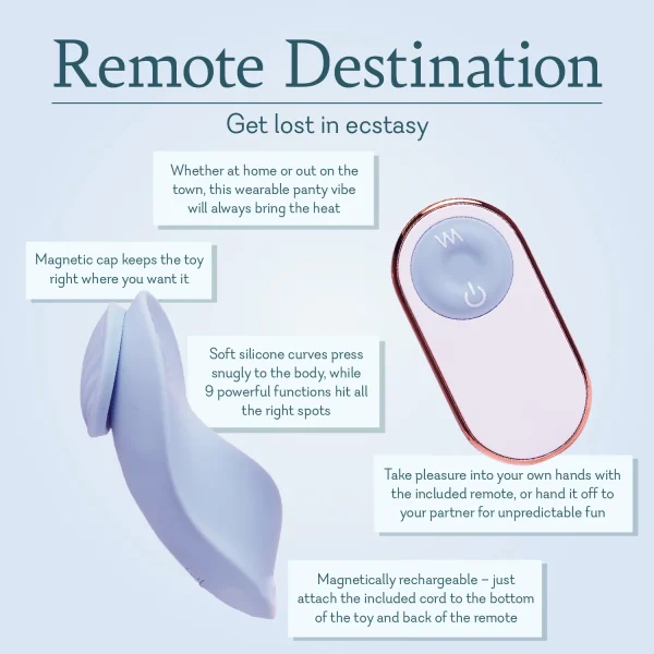 Bedroom, hotel suite, or out on a date – reach paradise with a wearable clitoral vibe that promises pleasure no matter where your adventures take you. Remote Destination can be used without a remote but for a sexcapade that’ll have you begging for more, give your partner control! 3 vibrating speeds and 6 pulsing patterns mean they’ll have plenty of ways to tease and surprise you. To play, simply place the toy in your panties and attach the magnet to the outside; the magnetic design and contoured shape help ensure vibrations hit the right spot.